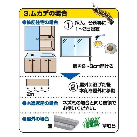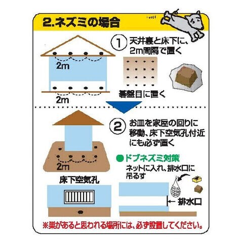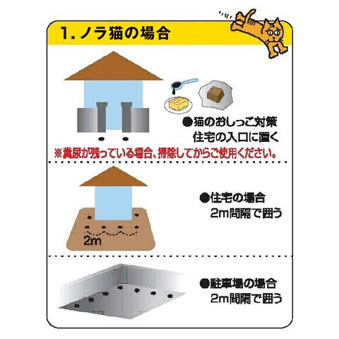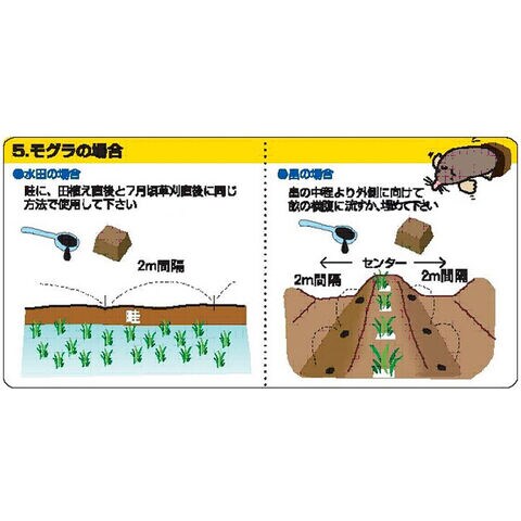 【使用方法】※対象物が出没する場所に1mあたり10粒程度を目安に巻いてください。 ※対象物が地中にいる場合(モグラ等)、約1mおきに直線状に平行に複数列になるように10粒程度撒いてください。 ※対象物が屋内にいる場合(ムカデ等)、は押入れ ※台所・天井・床下等が有効です。皿状のものあるいはアルミホイルで容器を作り、10粒程度を1m置きに設置して下さい。