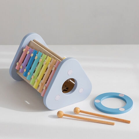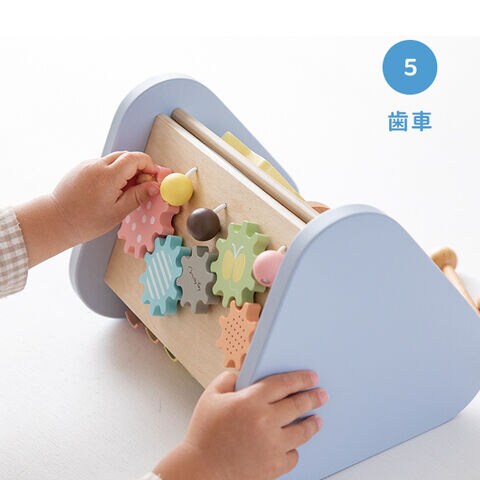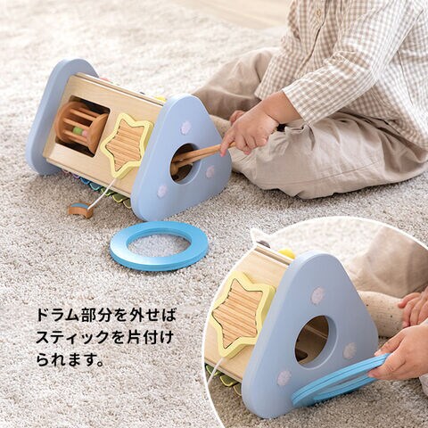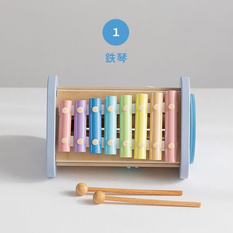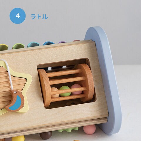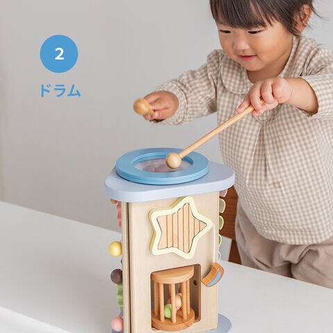 まるで森の小さな音楽会。鉄琴、ドラム、ラトル、ギロ、歯車・・・カラフルでやさしい音たちが、お子さまの感性を優しく育む多機能音あそびトイです。