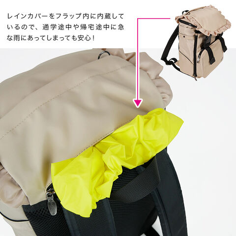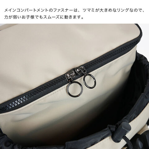 ・大きめリングファスナー、容量調整できるサイドファスナー、レインカバー内蔵など、使いやすさにも配慮。
