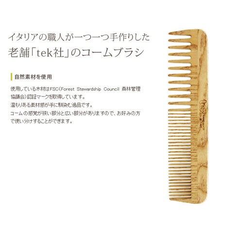 イタリア職人がひとつひとつ手作りした老舗ブランド「Tek社」人気の木製 ヘアーブラシ コームです。使用している木材はFSC(Forest StewardshipCouncil 森林管理協議会)認証マークを取得しています。髪や頭皮にも優しく、温もりあるウッド素材感が手に馴染む逸品です。コームの感覚が狭い部分と広い部分がありますので、お好みの方で使い分けすることができます。