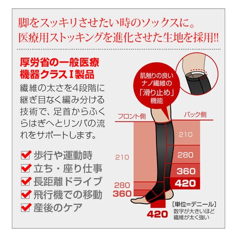 つかれた脚をケアする医療機器衣類。ふくらはぎ引き締めソックスとして、立ち仕事・座り仕事・飛行機の移動・長距離ドライブ・運動時の足サポートなどなど、様々なシーンで、お疲れの足に快適にお使い頂けます。