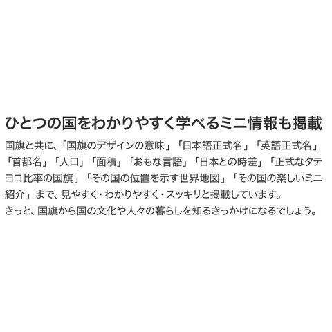 国旗と共に、「国旗のデザインの意味」「日本語正式名」「英語正式名」「首都名」「人口」「面積」「おもな言語」「日本との時差」「正式なタテヨコ比率の国旗」「その国の位置を示す世界地図」「その国の楽しいミニ紹介」まで、見やすく・わかりやすく・スッキリと掲載しています。