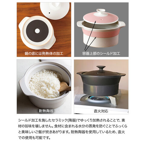 シールド加工を施したセラミック(陶器)でゆっくり加熱されることで、素材の旨味を壊しません。食材に含まれる水分の蒸発を防ぐことでふっくらと美味しいご飯が炊きあがります。