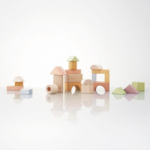 まずは歯固めやカチカチ打ち鳴らして音遊びとして。お座りができたら、大人が積んだつみきを崩して、形の変化を楽しむ。さらに年齢が上がると、自分で組み立てて車や家などを創造。年齢とともに変化する遊びを通して、創造力・集中力・手指の発達を自然に育みます。
