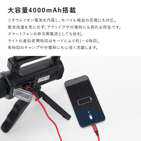 4000mAhのリチウムイオン電池を内蔵し、スマホ充電にも対応。アウトドアや停電時の非常電源としても活躍します。