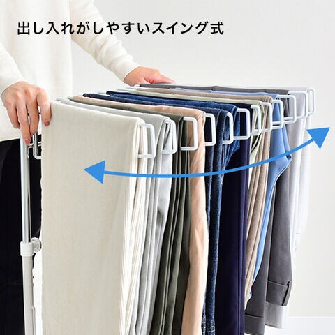 通常のハンガーでは対応しにくいワイドパンツも、ラインを崩さず収納できます。