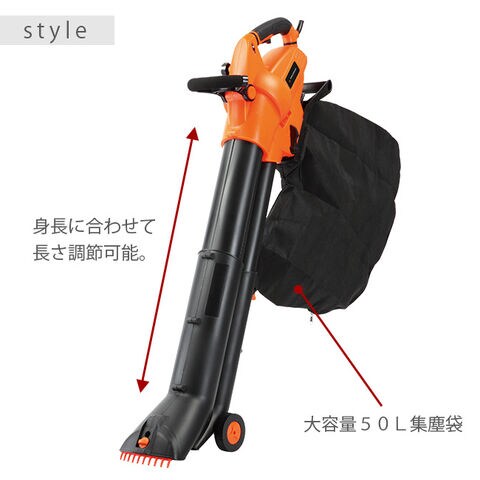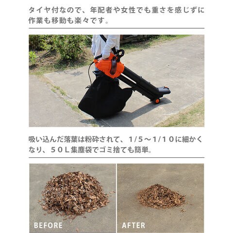 また、ノズル先にはタイヤがついているので年配の方や女性でも重さを感じにくく、作業や移動も楽々。 たっぷり容量50リットルの集塵袋に吸い込んだ落ち葉は粉砕され、1/5~1/10に細かくなるので処分も簡単です。
