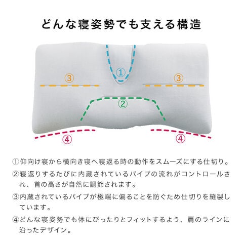 ●寝返りに対応する構造…特許技術を用いた仕切りの中に、柔軟かつ弾力性に優れた特殊パイプ素材を中材に使用。寝返りを打つたびに中材の流れがコントロールされ形状が変化し、肩や首の高さが調整されます。頭、首、肩を適切に支え負担を軽減する設計で、仰向けでも横向きでも自然にフィットします!一晩中快適な寝姿勢をサポートします。