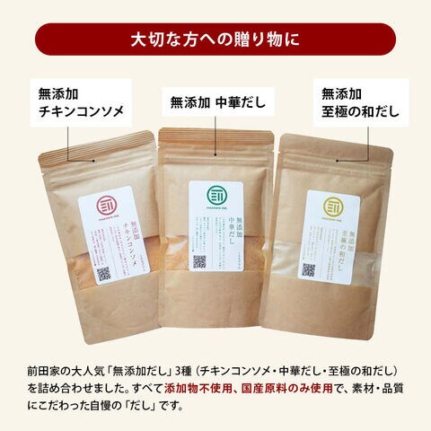 前田家 無添加 だし ギフト 3種詰合せ 各100g 粉末 チキンコンソメ 中華だし 至極の和だし セット 国産 無塩 化学調味料不使用 グルテンフリー お中元 お歳暮 内祝 プレゼント ギフトボックス 贈り物 出産祝 送料無料 MAEDAYA