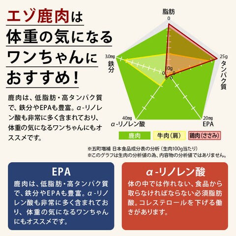 | 原材料 | えぞ鹿肉(日本)、小麦粉、大豆たん白、小麦グルテン、食塩、ビタミンE、保湿剤(ソルビトール、プロピレングリコール)、保存料(亜硝酸Na、ソルビン酸Na、デヒドロ酢酸Na)、GDL、結着剤(ポリリン酸Na)、pH調整剤(乳酸)、酸化防止剤(エリソルビン酸Na) |