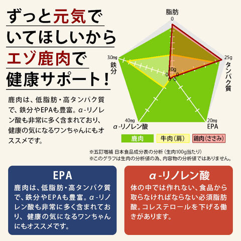 | 原材料 | 蝦夷鹿肉、小麦粉、大豆たん白、小麦グルテン、食塩、ビタミンE、保湿剤(ソルビトール、プロピレングリコール)、保存料(亜硝酸Na、ソルビン酸Na、デヒドロ酢酸Na)、GDL、結着剤(ポリリン酸Na)、pH調整剤(乳酸)、酸化防止剤(エリソルビン酸Na) |