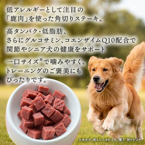 | 原材料 | エゾ鹿肉(国産)・加工澱粉・大豆たん白・小麦粉・グリセリン・ショ糖・食物繊維・食塩・コエンザイムQ10・グルコサミン・プロピレングリコール・ソルビトール・GDL・ポリリン酸Na・保存料(ソルビン酸K・デヒドロ酢酸Na)・酸化防止剤(エリソルビン酸Na)・発色剤(亜硝酸Na)・着色料(赤106) |