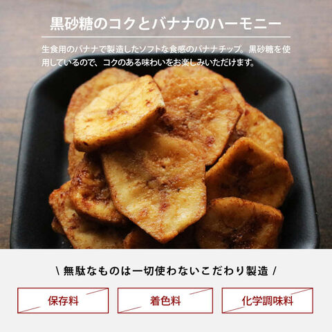 | 原材料 | バナナ(キャベンディッシュ種・フィリピン)、ココナッツオイル、黒砂糖 |