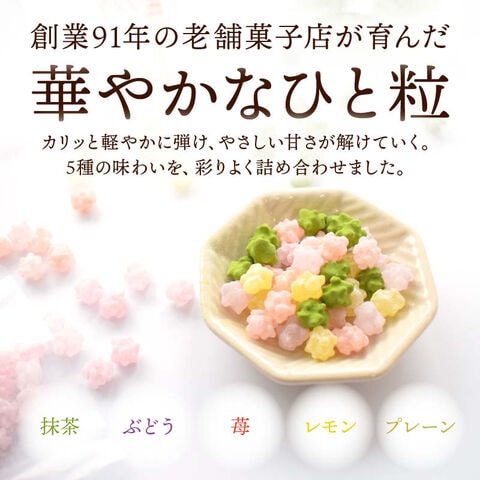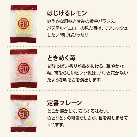 | 原材料 | 【ぶどう】砂糖(国内製造)、ぶどう果汁パウダー(デキストリン、ぶどう果汁) 【抹茶】砂糖(国内製造)、抹茶 【レモン】砂糖(国内製造)、レモン果汁パウダー(デキストリン、レモン果汁)/着色料(クチナシ) 【苺】砂糖(国内製造)、いちご果汁パウダー(いちご果汁、デキストリン)/着色料(アントシアニン) 【プレーン】砂糖(国内製造)/シソ色素、クチナシ黄色素 、トウガラシ色素、ベニコウジ黄色素、クチナシ青色素 |
