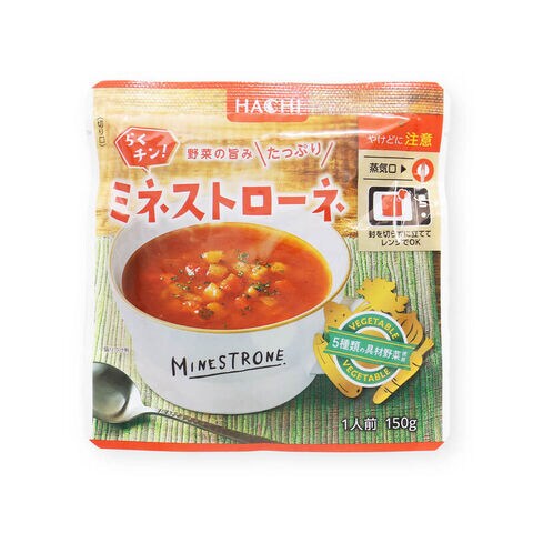 ハチ食品 らくチン! ミネストローネ 150gx5袋 レンジで簡単調理 レトルト 1人前 150g 野菜の旨みたっぷり 5種類の具材野菜使用 Hachi トマト 野菜スープ 常温 一人暮らし まとめ買い 家庭用 メール便 前田家 MAEDAYA