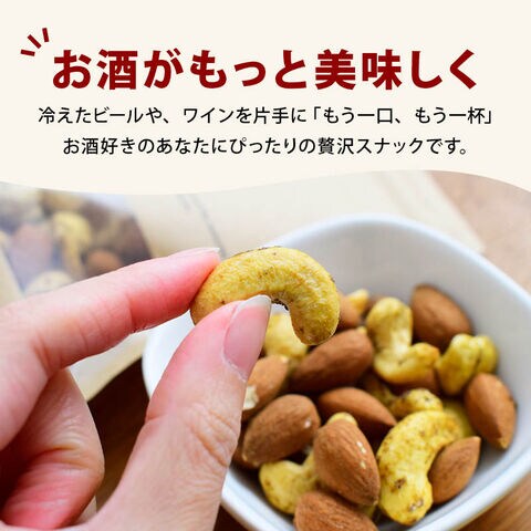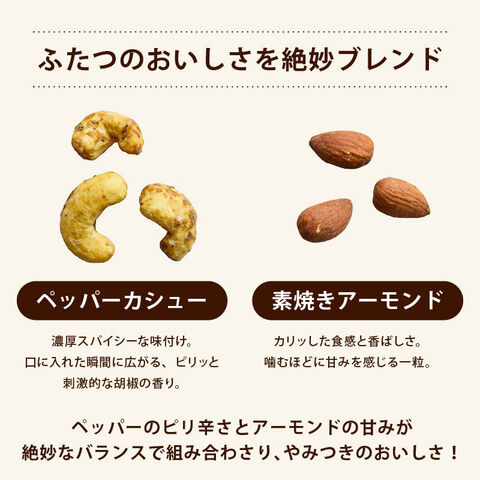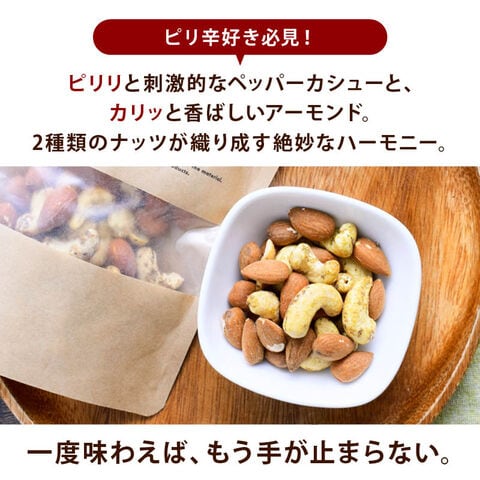 | 原材料 | アーモンド(アメリカ)、ペッパーカシュー[カシューナッツ(インド)、ペッパーシーズニング(食塩、香辛料、砂糖、デキストリン)、砂糖結合水飴/調味料(アミノ酸等)、香辛料抽出物、加工でん粉] |