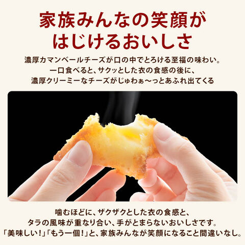 | 原材料 | チーズフード(クリームチーズ、ゴーダチーズ、カマンベールチーズ、カマンベールチーズパウダー、植物油脂)(国内製造)、魚肉加工品(魚肉すり身(魚肉、砂糖)、でん粉、食塩、植物性たん白、砂糖、植物油脂)、衣(パン粉、小麦粉、でん粉)/ソルビトール、安定剤(加エデンプン、増粘多糖類)、乳化剤、調味料(アミノ酸等)、増粘剤(グァーガム)、(一部に乳成分・小麦・大豆を含む) |