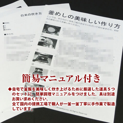 自宅で釜飯を美味しく炊き上げるために厳選した道具5つのセットに、簡単調理マニュアルをつけました。 具は別途お買い求めください。