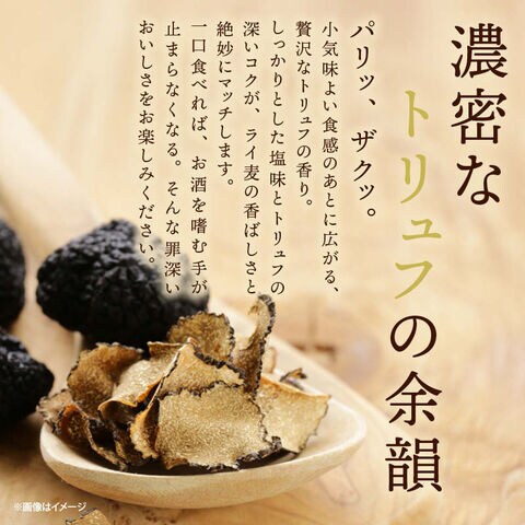 | 原材料 | 小麦粉、植物油、でん粉、ライ麦、黒トリュフシーズニング、食塩、イースト、バター/膨張剤、香料、調味料(アミノ酸等)、酸味料、(一部に小麦・乳成分・大豆を含む) |