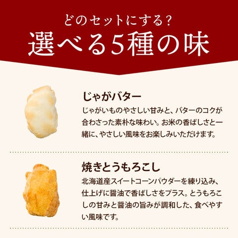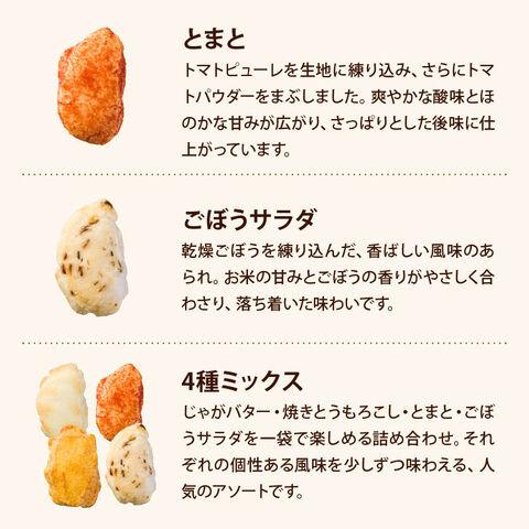 | 原材料 | 【じゃがバター】もち米(国内産)、植物油脂、乾燥マッシュポテト、バター、食塩、昆布エキス、香辛料/調味料(アミノ酸等)、(一部に乳成分を含む) 【焼きとうもろこし】もち米(国内産)、醤油、乾燥スイートコーン粉末、みりん、砂糖、澱粉、果糖ぶどう糖液糖、食塩/調味料(アミノ酸等)、(一部に小麦・大豆を含む) 【とまと】もち米(国内産)、植物油脂、乾燥トマト粉末、トマトピューレー、食塩、昆布エキス、香辛料/調味料(アミノ酸等) 【ごぼうサラダ】もち米(国内産)、植物油脂、ごぼう、食塩、ごぼう風味シーズニング、昆布エキス、香辛料/調味料(アミノ酸等)、香料、着色料(カラメル)、甘味料(ステビア)、(一部に小麦・乳成分・カニ・大豆・ごま・豚肉を含む) |