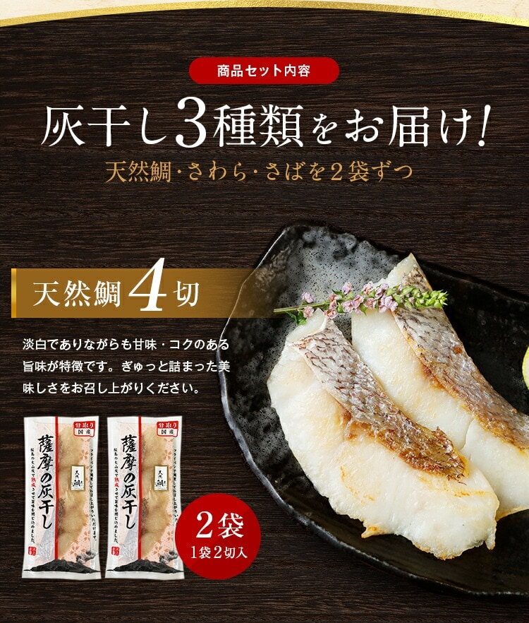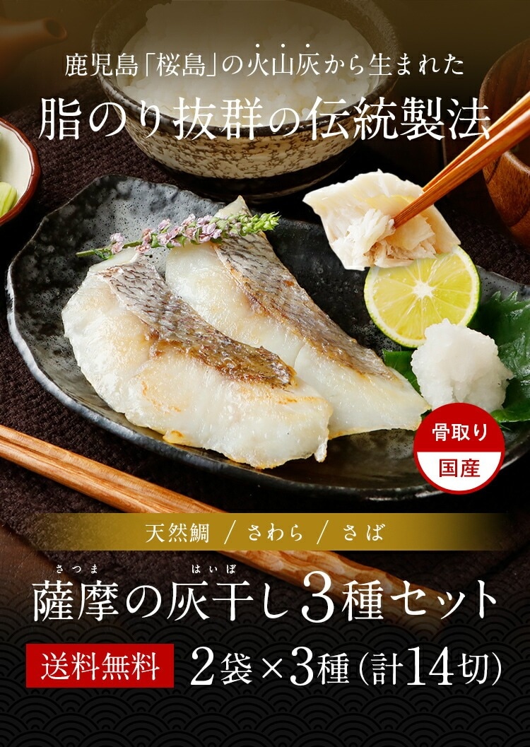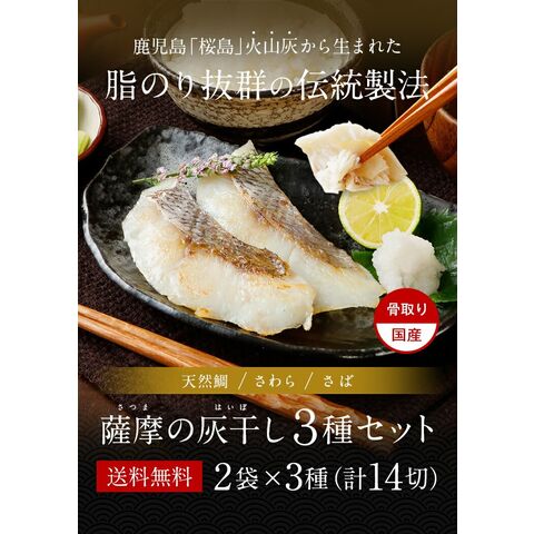 薩摩の灰干し 2袋×3種 14切 セット 干物 送料無料 鯖 さば 天然鯛 さわら 鹿児島県産 国産 詰め合わせ ギフト 贈り物 お取り寄せ 火山灰 桜島 高級 グルメ 土産 特産品 ひもの 旨さに 訳あり ひと手間 プレゼント 御祝 父の日 [産直]