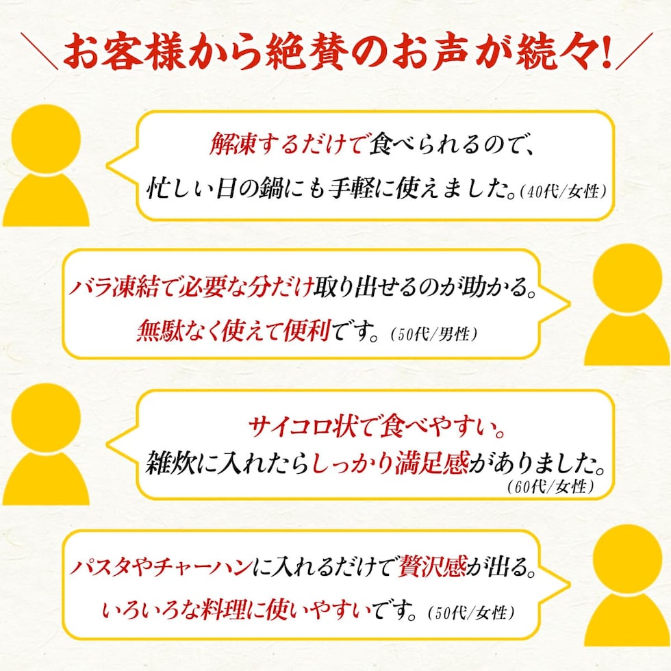 ◎ボイル済みで解凍後そのまま使える ◎サイコロカットで料理に混ぜやすい ◎IQF(バラ凍結)で必要分だけ取り出せる ◎かに鍋・炒め物・パスタなどアレンジ自在 ◎冷凍ストックで食卓の即戦力 ボイル済みのズワイガニを食べやすい“肩コロ”サイズにカットし、IQF(バラ凍結)で仕上げました。解凍後そのまま使えるので、包丁いらずで時短に一品が完成。 かに鍋や雑炊はもちろん、チャーハン・パスタ・サラダなどにも混ぜやすく、必要な分だけ取り出せるのも便利です。 冷凍庫に常備しておけば、食べたい時に手軽にカニの満足感が楽しめます。 |