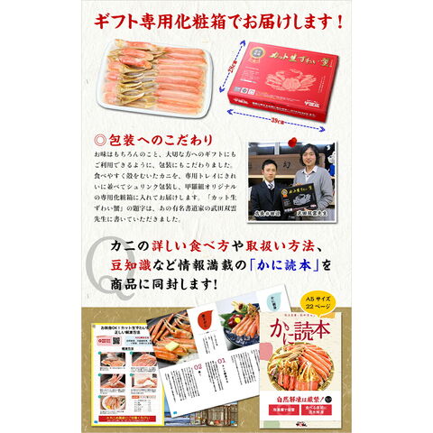 | ★グルメ大賞カニ部門受賞! ★楽天年間ランキング食品部門1位受賞! ★TVのグルメ番組や雑誌のお取り寄せコーナーでの紹介多数! ★お客様満足度90%以上の高評価!絶賛のお声が続々♪ ★カット済みだから包丁や調理バサミ不要で食べやすい! ★お刺身でも食べられる高鮮度!鍋・焼き・しゃぶ…食べ方いろいろ! ★専用化粧箱&食べ方の説明書&のし対応!贈り物にもお薦め! 「カニは好きだけど、食べるのが面倒…」「食べるのに夢中になって、無言になってしまう…」「身の詰まっていない不良品が送られてきそう…」そんなお客様のお声をもとに、この【カット生ずわい蟹】は2011年に開発された商品です。新鮮なズワイガニを厳選し、包丁や調理バサミがなくても簡単に食べられるように、カニの足を1本ずつ職人が丁寧にカットしてお届けしております。販売開始から5年目─、ついにお刺身でも食べられる商品化に成功しました。カニ本来の甘味が繊維の一本一本にぎっしりと詰っていて、まさに「とろける甘さ」が絶品です!カニ刺し、しゃぶしゃぶ、鍋、雑炊、焼きガニ、てんぷら…専門店でしか食べられない本格かに料理のフルコースを、家族みんなで手軽に、存分にお楽しみ頂けると確信しております。 |