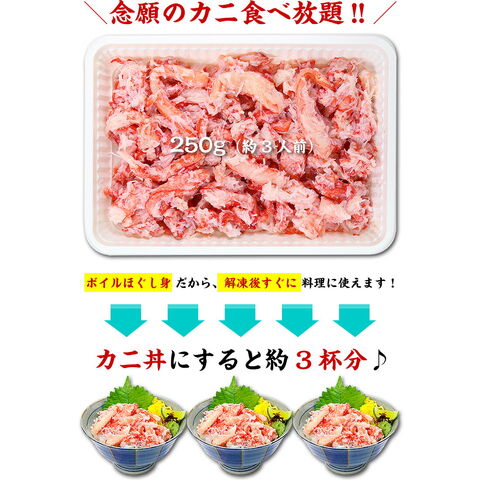 ボイルほぐし身になってるので自然解凍後、そのままお召し上がり頂けます。炒飯やカニ玉、パスタ、炊き込みご飯、サラダなど和洋中に関わらず幅広くご利用頂けます。 |