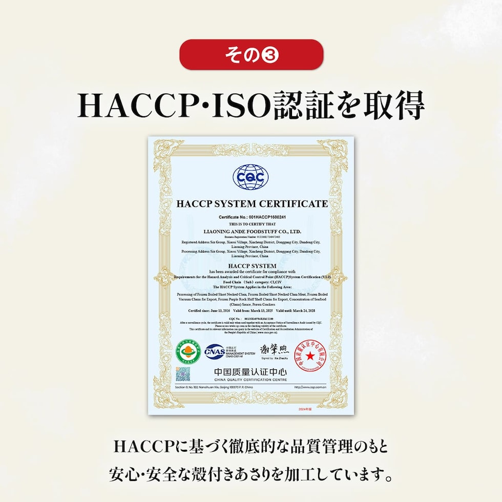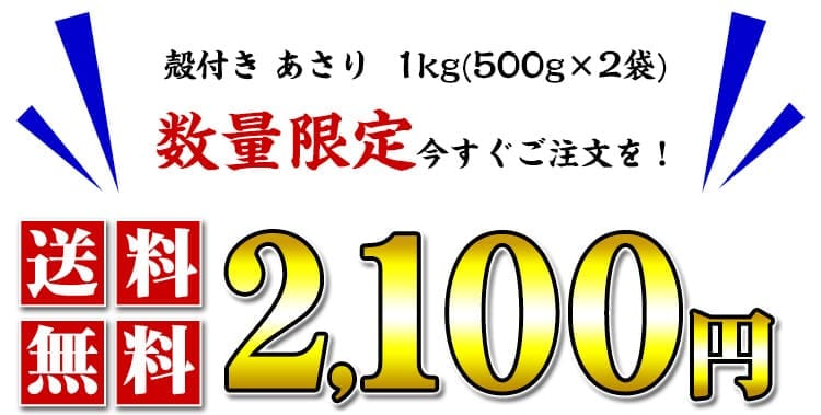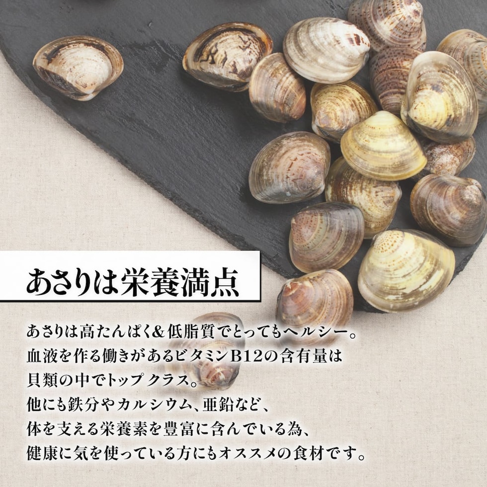 ◎主婦/主夫の強い味方 便利な殻付きあさり ◎砂抜き済・加熱済で手間いらず♪ ◎高たんぱく&低脂質でとてもヘルシー ◎真空パックで鮮度と旨みをギュッと凝縮 ◎HACCP・ISO認証の工場で加工 砂抜き済・加熱済で解凍するだけで食べられる便利な殻付きあさりです。 HACCP・ISO認証の工場で徹底した衛生管理のもと加工されているため、お子様からお年寄りまで安心。 冷凍することであさりに含まれる「コハク酸」「遊離グルタミン酸」といった旨味成分が出やすくなるため、より強く旨味を感じることが出来ます。 さらにあさりは高たんぱく&低脂質でとってもヘルシー。 血液を作る働きがあるビタミンB12の含有量は貝類の中でトップクラス。 他にも鉄分やカルシウム、亜鉛など、体を支える栄養素を豊富に含んでいる為、健康に気を使っている方にもオススメの食材です。 1kgと大容量なので、あさりの酒蒸しやお味噌汁、パスタなどいろんな食べ方でお楽しみください。 |