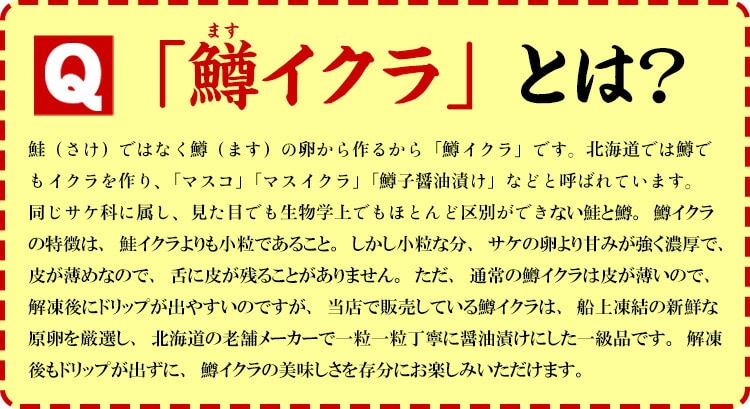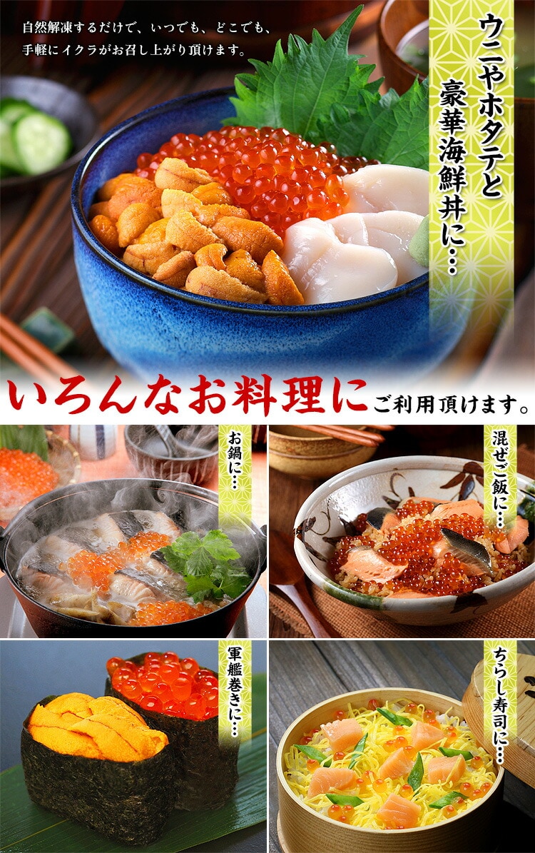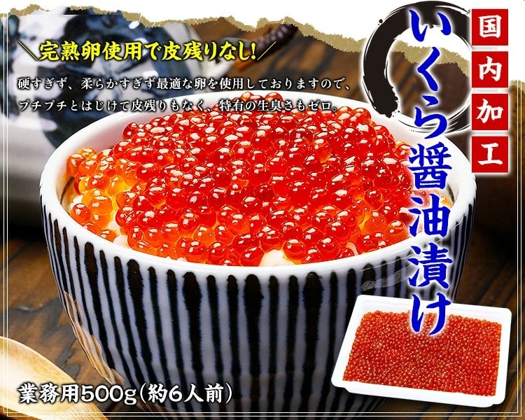 | イクラ醤油漬け500g <原材料>カラフトマスの卵(アメリカもしくはロシア産)、醤油、オリゴ糖、食塩、米発酵調味料、かつお節エキス、砂糖/調味料(アミノ酸)、粉末水飴、還元水飴、昆布だし/調味料(アミノ酸等)(一部に小麦、大豆、いくらを含む) ※製造メーカーにより、一部原材料が異なる場合がございます。 |