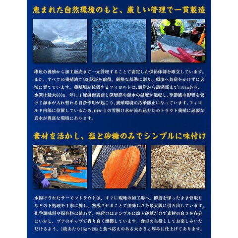 極寒のノルウェーで、環境に配慮しながら育てられたASC認証のサーモントラウトを厳選し、現地で生からスモークした鮮度抜群のワンフローズンのスモークサーモンです。サーモンの養殖場はフィヨルド内部にあり、山からの雪解け水が豊富に流れ込むため養殖に最適な環境です。ASC認証の基準に則り、抗生物質や成長促進剤などを使っていないエサを与え、水温や生育状態など、常にコンピューター管理して品質の良いサーモントラウトを養殖しています。水揚げされたサーモントラウトは、すぐに現地の加工場へ。鮮度を保ったまま骨取りなどの下処理を丁寧に施し、熟成させることで美味しさを最大限に引き出しています。味付けはシンプルに塩と砂糖だけで素材の良さを存分にいかし、くせの無いブナのチップで香り良く燻製しました。食卓の主役としてお楽しみいただけるよう、1枚あたり大判の15g~20gと食べ応えのある大きさと厚みに仕上げてあります。おつまみやサラダはもちろん、サンドウィッチや手巻き寿司など、メイン料理にもご利用頂けます。 |
