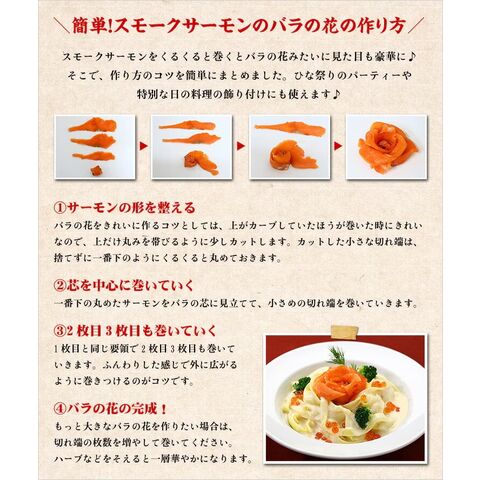 | スモークサーモン正規品150g×10p 原材料:ノルウェー産サーモントラウト(養殖)、食塩、砂糖 |