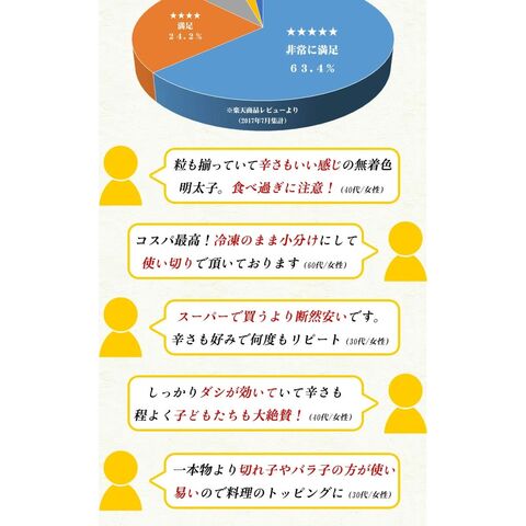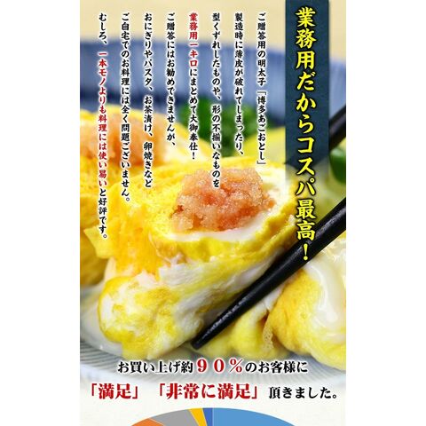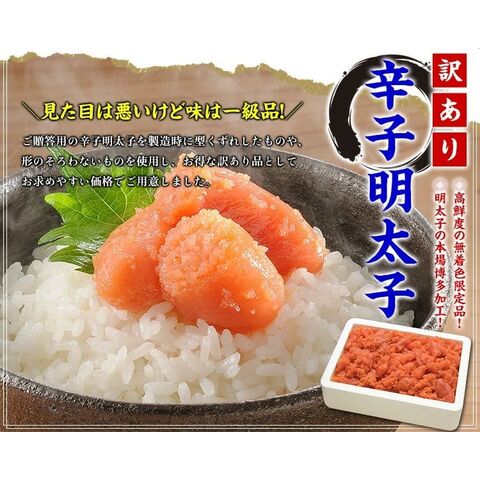 贈答用の明太子を製造時に、どうしても薄皮が破れてしまうことがります。そんな型くずれしたものや、形のそろわないものを製品化したのが、今回ご紹介する訳あり明太子です。見た目は悪いのでギフトなどにはお勧めできませんが、お味は正規品と変わらないので、ご家庭で食べるにはこちらで十分。使う量を気にせず念願の食べ放題も♪食べ切れない場合は小分けして冷凍保存も可能です。 |