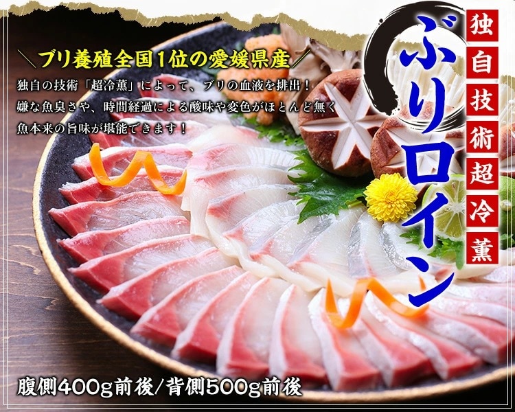 超冷薫ぶりロイン (腹側400g前後もしくは背側500g前後) ※腹・背はご指定できません ブリロイン 鰤ロイン 刺身 スキンレス 柵 さく お中元 冷凍食品 年末年始 正月 お歳暮