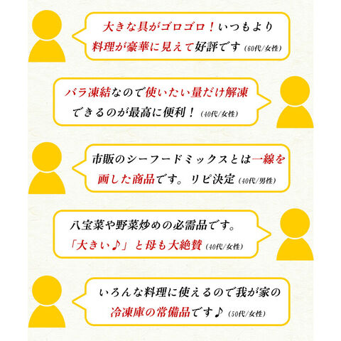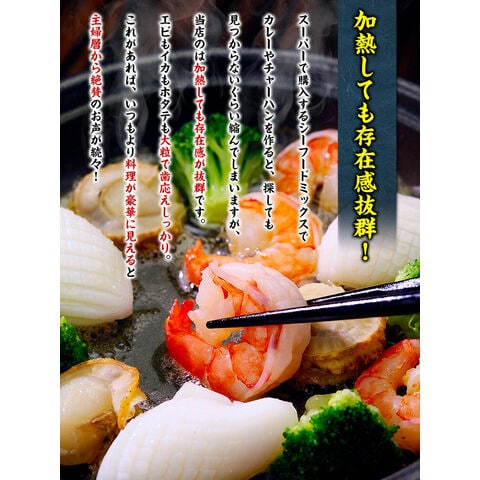 「市販のシーフードミックスって、1粒1粒のサイズが小さいから、加熱すると消えちゃうんです…。もっと大粒で食べ応えのある商品ってありませんか?」そんなお客様のご要望にお応えすべく、全国のいろんなメーカーを探し回ったのですが結局見つからず、無いのなら作ってしまえ!っということで、甲羅組オリジナルで特別にご用意しました!大粒のエビ、ホタテ、イカの3種類をミックスしてボリューム満点の業務用スタイルでお届けします。カレーやピラフ、ちゃんぽん、お好み焼き…いろんな食べ方でご堪能ください♪ |