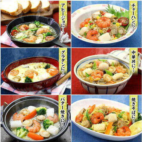 流水で表面の氷の膜を洗い流し、自然解凍してから料理にお使いください。焼きそば、中華丼、カレー、アヒージョ、チャーハン、いろんな食べ方でお楽しみいただけます。 |