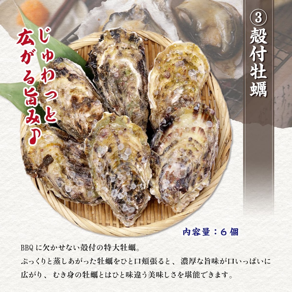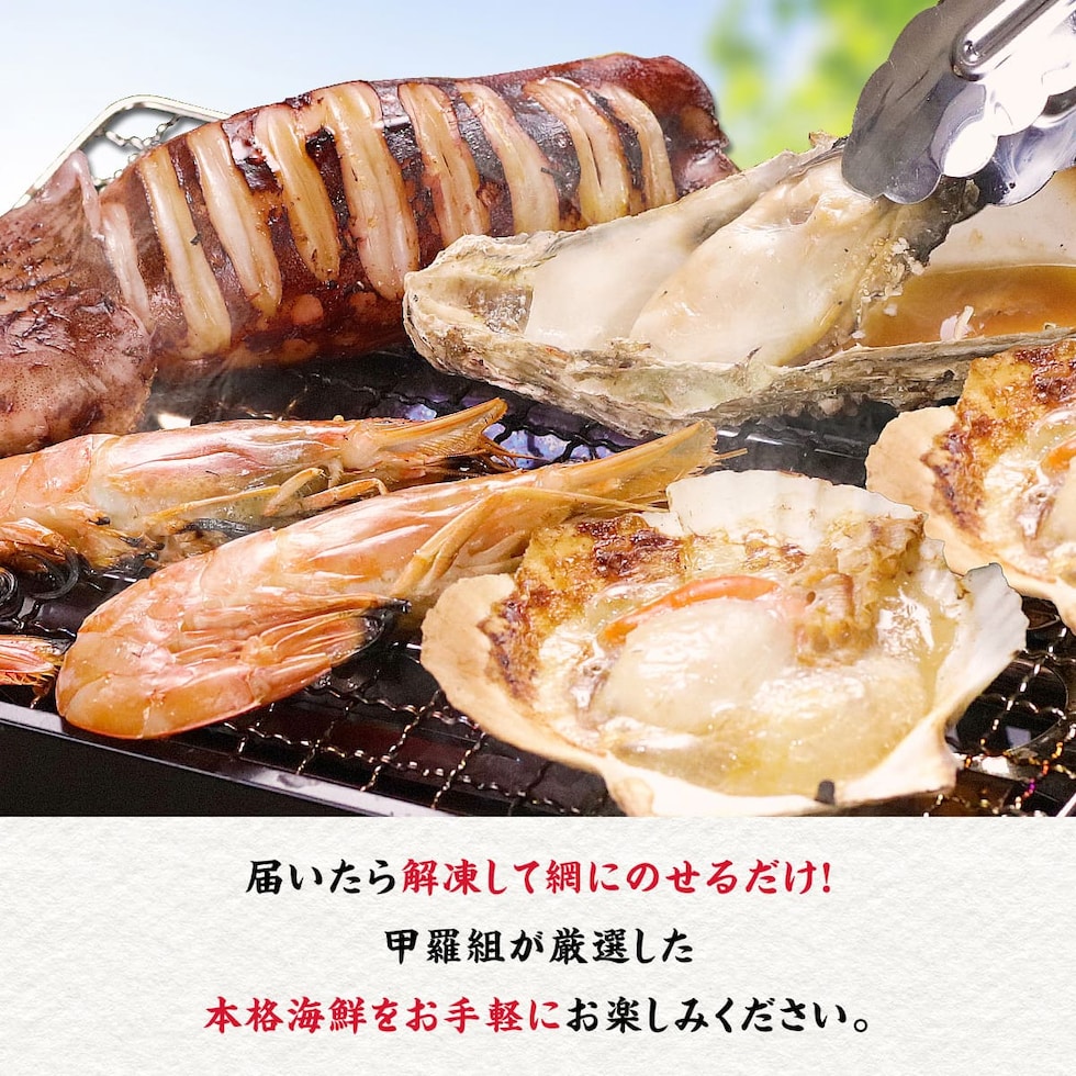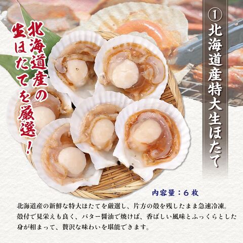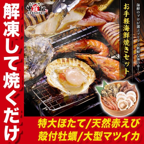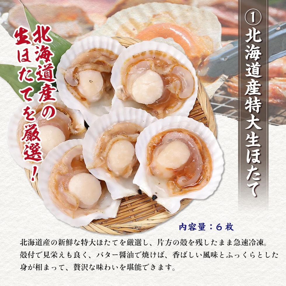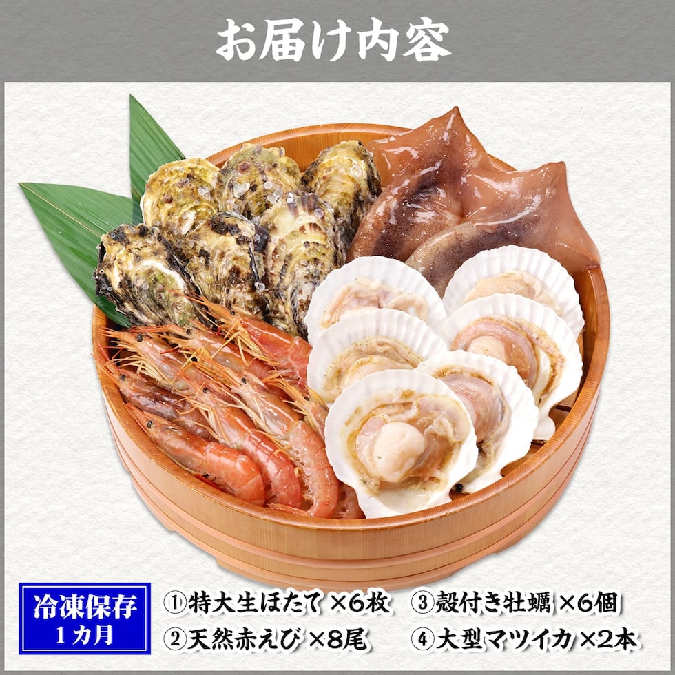 | ●海鮮焼きセット 【1】北海道産特大生ほたて(片貝付き)(北海道産)×6枚 【2】お刺身鮮度 天然赤えび (アルゼンチン産)×8尾 【3】殻付牡蠣(宮城県産)×6個 【4】マツイカつぼ抜き(中国産)×2本 |
