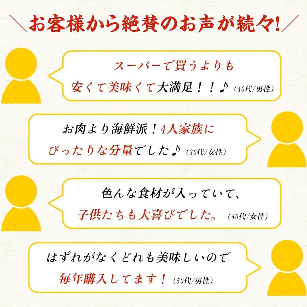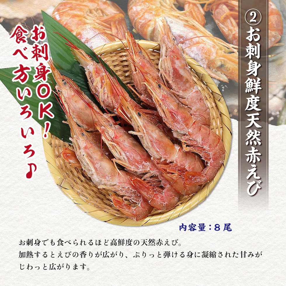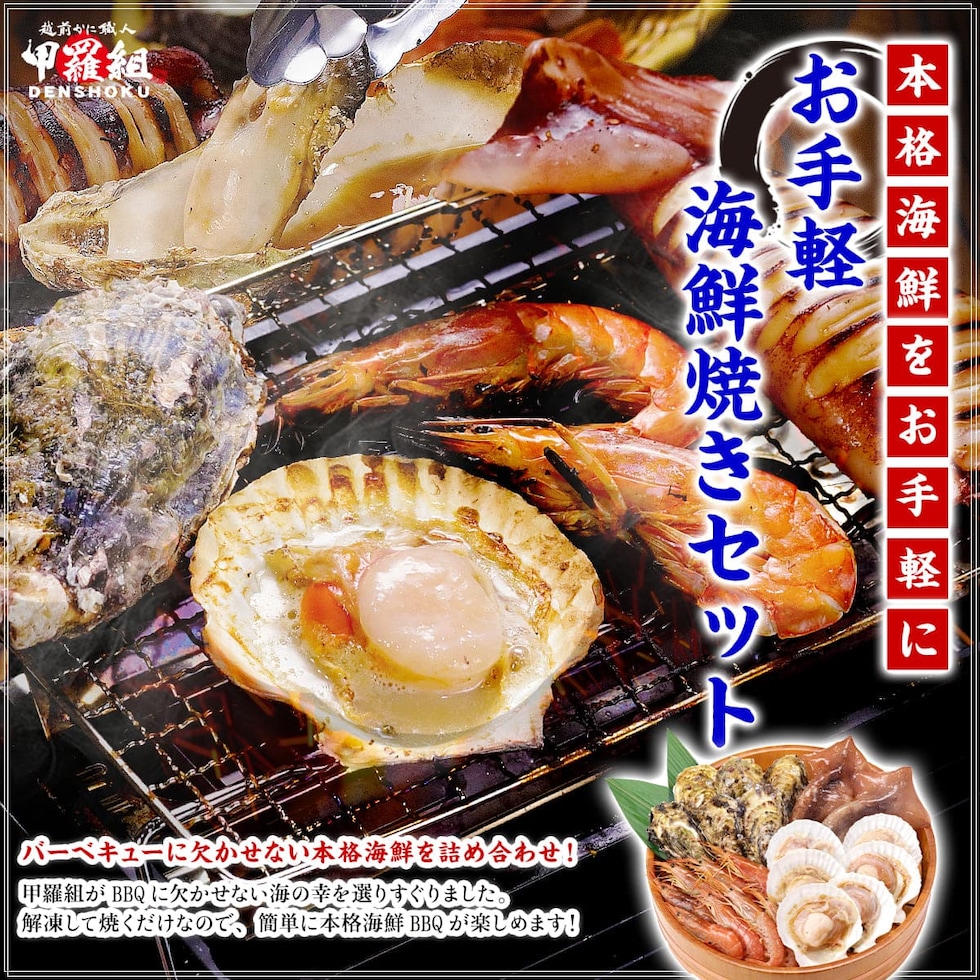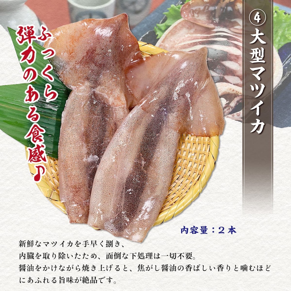 | ●海鮮焼きセット 【1】北海道産特大生ほたて(片貝付き)(北海道産)×6枚 【2】お刺身鮮度 天然赤えび (アルゼンチン産)×8尾 【3】殻付牡蠣(宮城県産)×6個 【4】マツイカつぼ抜き(中国産)×2本 |
