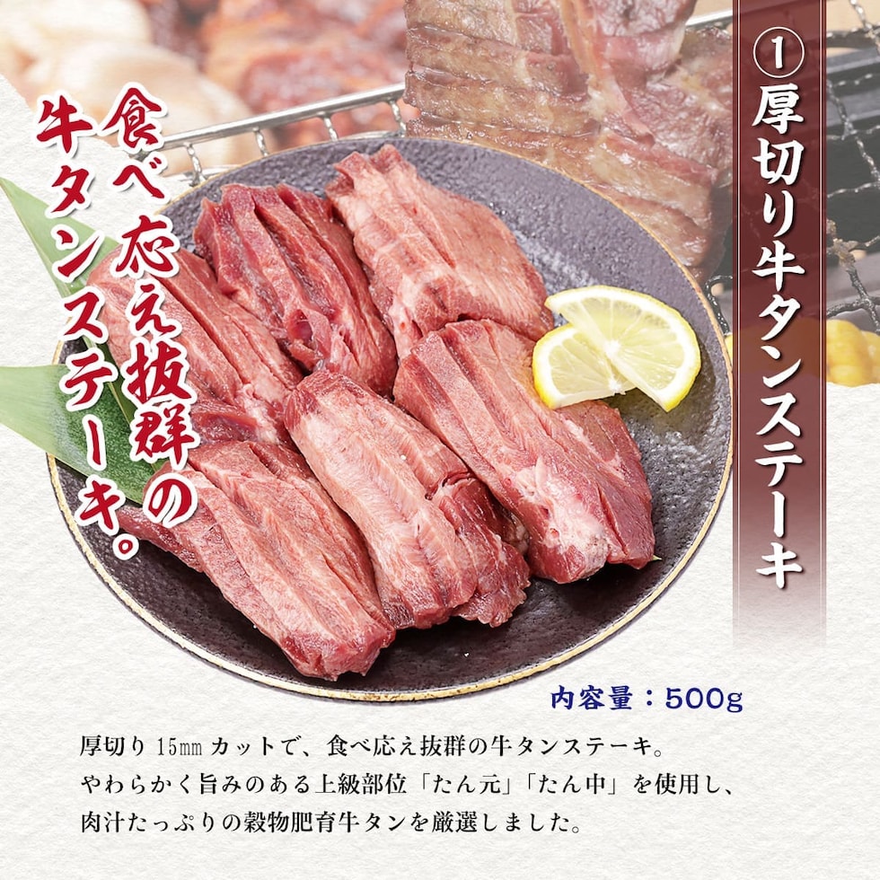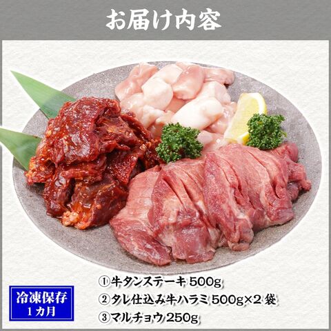 | ●焼肉セット 【1】牛タンステーキ 500g 牛肉(本商品製造工場では乳成分、卵、小麦、大豆、ごま、りんご、豚肉を含む商品を製造しております。) 【2】タレ仕込み牛ハラミ 500g×2袋 小麦・牛肉・ごま・大豆 【3】マルチョウ 250g なし |