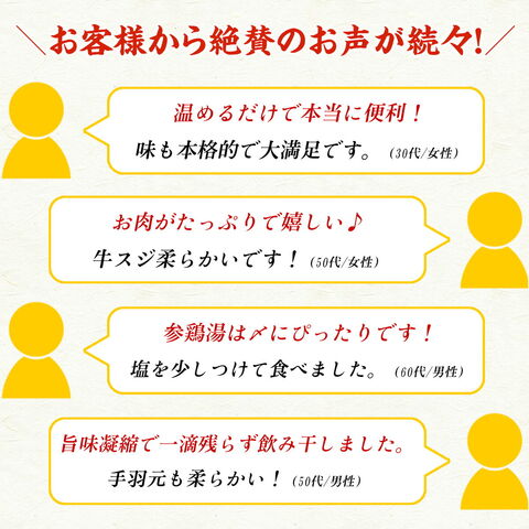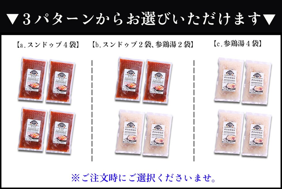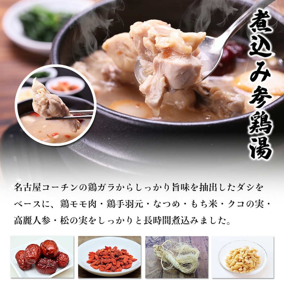 | 温めるだけの簡単調理で本場の味をご自宅でお楽しみいただけます♪ 牛すじスンドゥブ・煮込み参鶏湯の2種から3パターンの組み合わせでご選択いただけます。 【牛すじスンドゥブ】 厳選した国産牛スジ肉から出る、旨味たっぷりのダシとメーカー独自のブレンドで作り上げた豆味噌で味を整えたクセになる絶品スンドゥブです。 絹ごし豆腐を別途ご用意してください。お好みで卵を入れても美味しくお召し上がりいただけます。 ★追加で入れるとおいしい具材 卵黄・キムチ・ねぎ・ニラ・もやし・えのき・チーズ 【煮込み参鶏湯】 名古屋コーチンの鶏ガラからしっかり旨味を抽出したダシをベースに、鶏モモ肉、手羽元、なつめ、もち米、クコの実、高麗人参、松の実をしっかりと長時間煮込んだ、煮込み参鶏湯です。 ★追加で入れるとおいしい具材 軽く下ゆでした鶏肉・ねぎ・刻んだショウガ |