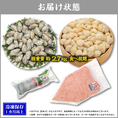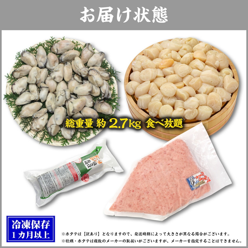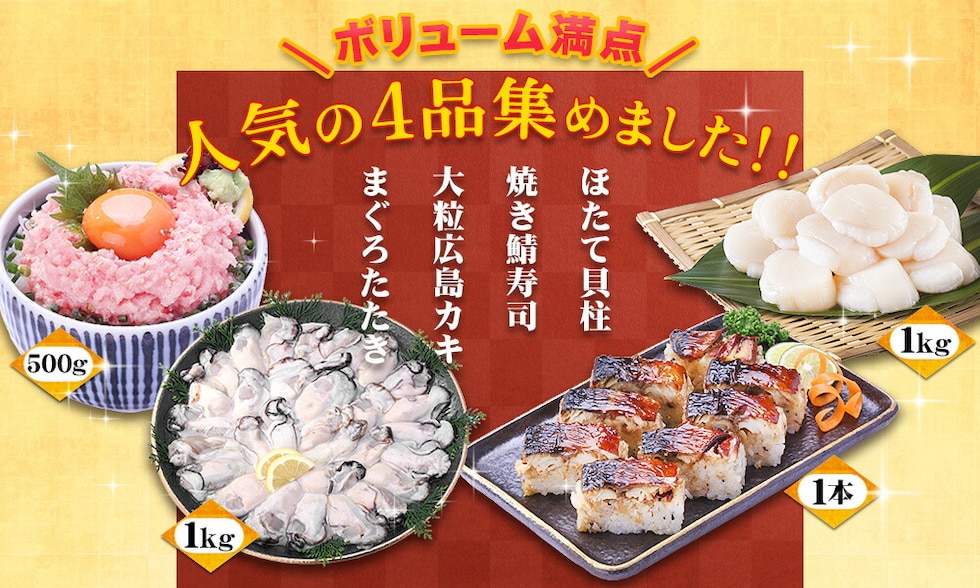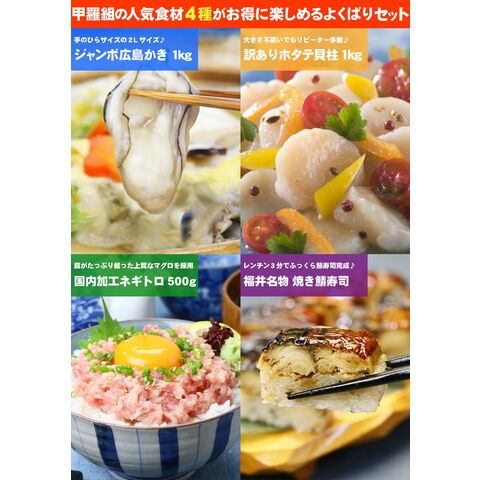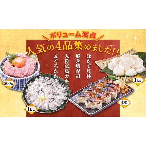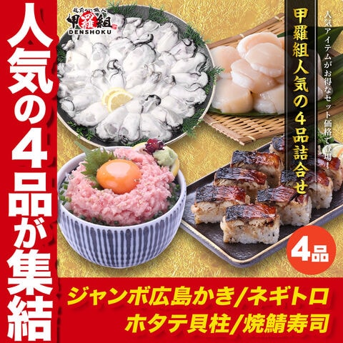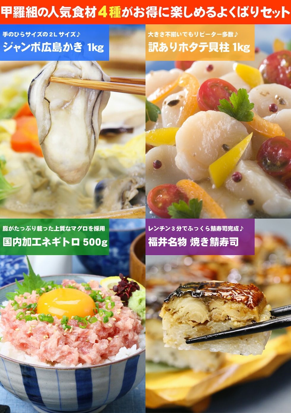 甲羅組人気食材4種がお得に楽しめるよくばりセット 牡蠣 ほたて 貝柱 鯖寿司 すし ネギトロ マグロ 鮪 冷凍食品