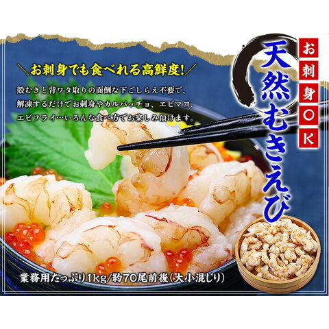 お刺身でも食べられる高鮮度の希少な天然ムキエビの訳あり品が限定入荷!どんな訳ありかと言いますと、寿司ネタ用の赤エビの開き処理をする過程で加工ミスや、形の悪いモノを集めた訳あり品です。ただ、見た目は悪いですが寿司ネタ鮮度なのでお味は抜群!大小バラツキもあるため大特価でご奉仕いたします!殻むきと背ワタ取りの面倒な下ごしらえ不要で、解凍するだけでお刺身やカルパッチョ、エビマヨ、エビフライ…いろんな食べ方でお楽しみ頂けます!業務用たっぷり1kgの大ボリュームで食べ応えも抜群! 冷凍庫にストックしておくと、とても重宝する一品です。 |
