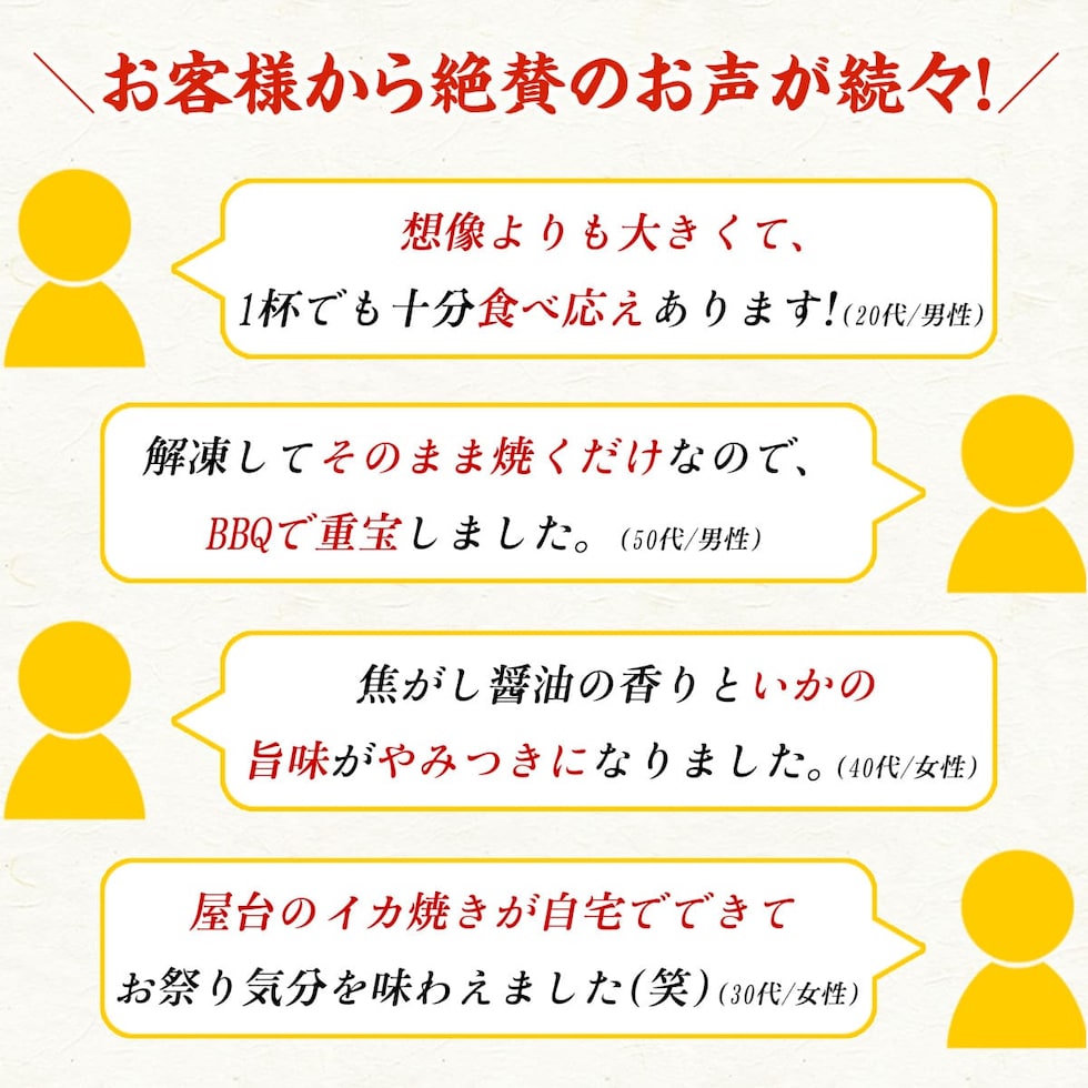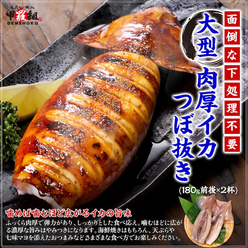 ◎ふっくら弾力のあるマツイカつぼ抜き ◎内臓処理済みなので面倒な下処理不要 ◎解凍してそのまま焼くだけ♪ ◎噛めば噛むほどあふれる旨味が絶品 ◎海鮮焼きやおつまみにぴったり 海鮮焼きの定番、マツイカ。中でも食べ応えのある大ぶりサイズだけを厳選しました。 内臓処理済みで、面倒な下ごしらえは不要。解凍してそのまま焼くだけで手軽に楽しめます。 醤油をかけながら焼き上げると、香ばしい焦がし醤油の香りと、噛むほどに旨味が口いっぱいに広がります。 BBQの主役に、天ぷらに、七味マヨを添えておつまみにするのもオススメです! 色々な食べ方でお楽しみください。 |