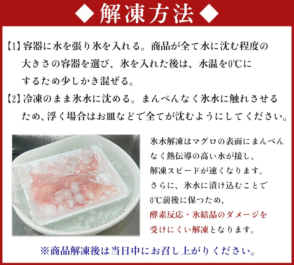 | 多めの氷を張った容器で流水解凍すると鮮度良く解凍することができます。 |