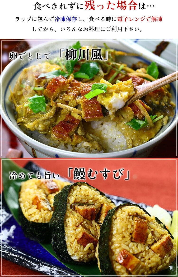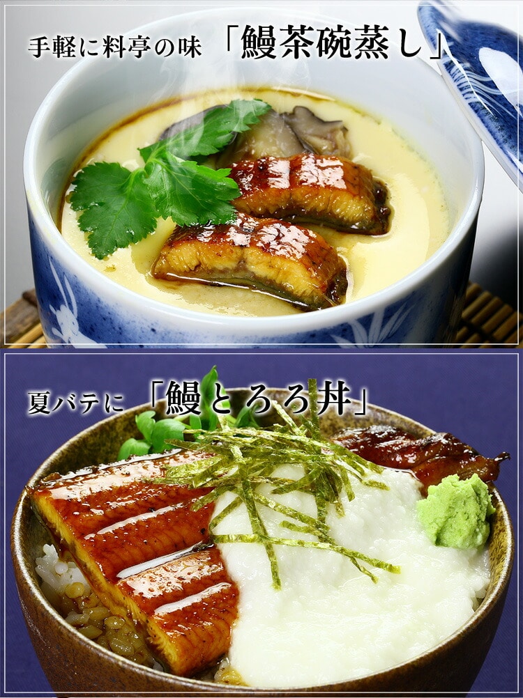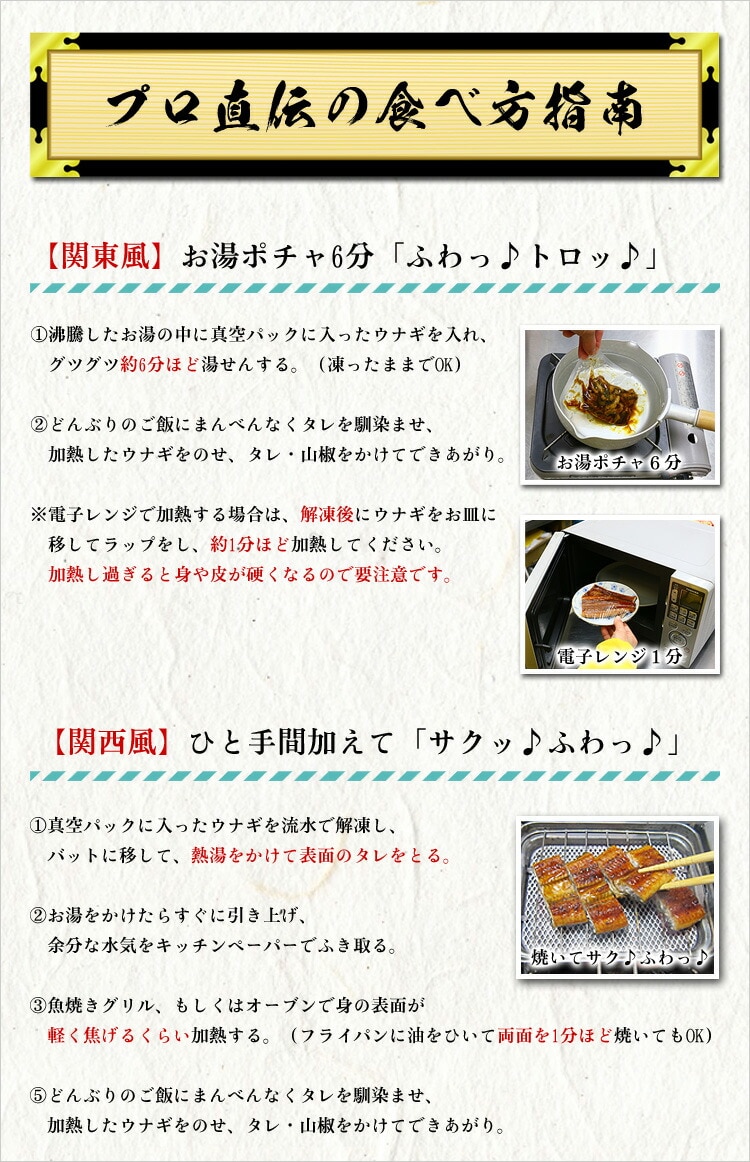 冷凍庫からウナギを取り出し流水で解凍し、湯せんで5分温めるか、お皿に移してラップをして電子レンジで1~2分ほど温めてお召し上がり下さい。 |