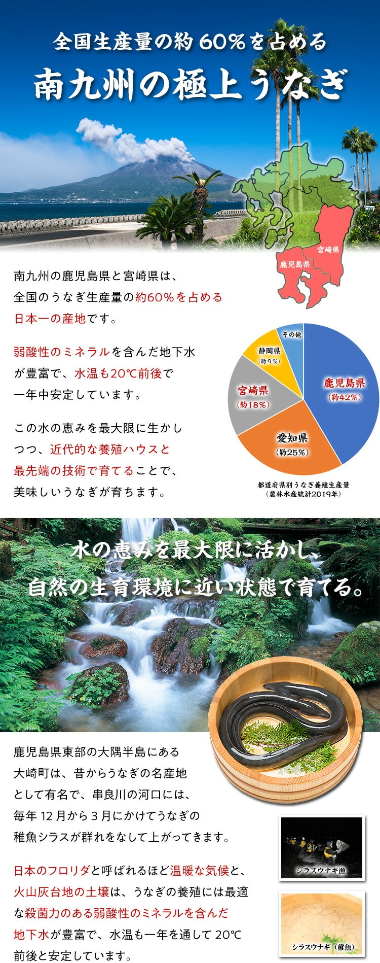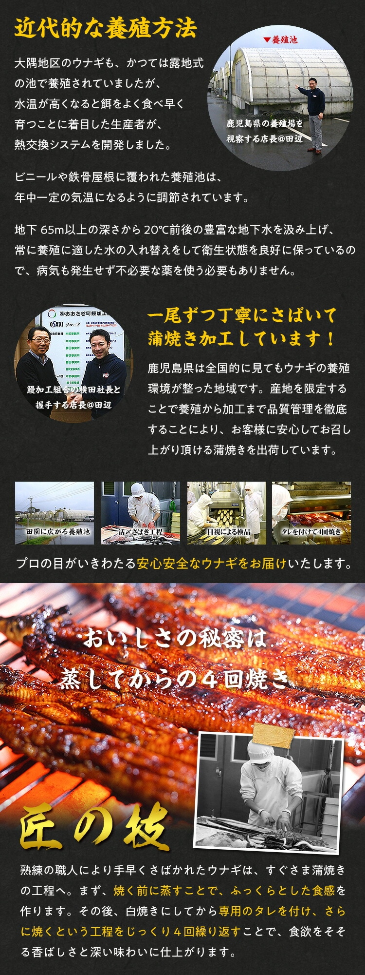 | ◎全国生産量の60%を占める南九州の極上うなぎ ◎日本のフロリダと呼ばれるほど温暖な気候で水温も安定! ◎火山灰土の地下水は殺菌力のある弱酸性でミネラル豊富! ◎水温、水位、水流等はすべてコンピューターで制御で24時間管理! ◎ギフト化粧箱&食べ方の説明書入りで贈り物にもお薦め! ウナギ全国生産量の60%を占める南九州より、専門店自慢の本格うなぎ蒲焼きを限定販売!大隅半島は日本のフロリダと呼ばれるほど温暖な気候で、火山灰度の地下水は殺菌力のある弱酸性でミネラルも豊富に含まれており、水温も20℃で一年中安定しています。この水の恵みを最大限に生かし、自然の生育環境に近い状態で育てることで、美味しいウナギが育つのです。池揚げされたウナギは熟練の職人により丁寧にさばかれて、すぐさま蒲焼きの工程に入ります。蒸してから白焼きにしたウナギに、秘伝の焼きタレを付けては焼くという工程を4回繰り返すことで、ふっくらとして香ばしい風味に仕上げてあります。焼きあがったウナギは、美味しさを保つためにすぐさま真空包装&急速凍結されますので、冷凍保存1ヶ月OK。湯せんor電子レンジで調理も簡単です。ご家庭で手軽に専門店の味がご堪能いただけます。 |