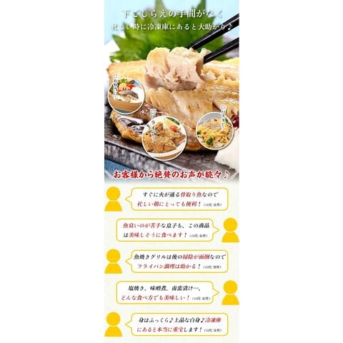 | フライパンで簡単調理!美味しい塩焼きホッケの調理方法をご紹介します。 ≪解凍&焼き方≫ 【1】食べる分だけ冷凍庫から取り出し、流水でフィーレの表面の汚れを洗います。 キッチンペーパーに包んで 冷蔵庫で5時間ほど解凍して下さい。 ※お急ぎの場合は電子レンジの解凍モードを使うか、冷凍のまま焼き始めるのも可能です。 【2】 塩焼きにする場合は、ホッケの両面に塩を少々振って10分おいて下さい。 (塩ホッケの場合は、代わりに全体に酒を振って下さい。) 【3】表面に出てきた水気をキッチンペーパーで丁寧に拭き取り、 味付け用の塩ひとつまみ振って下さい。(塩ホッケの場合、塩は不要です。) 【4】フライパンにサラダ油を熱し、ホッケの皮目を下にして中火で4~5分焼きます。 サラダ油をひくことで、表面がパリッと仕上がります。 【5】フライ返しで身を少し持ち上げて、皮目に焼き色がついていたら 身を崩さないように気をつけながらフライ返しで裏返して下さい。 ふたをしてさらに弱火で4~5分焼きます。 皮目に焼き目をつけてから蒸し焼きにすることでふっくらジューシーに仕上がります。 ※冷凍のまま焼いている場合は、この蒸しの時間を8~10分にして下さい。 【6】身はふっくらジューシーな焼きホッケが完成。 大根おろしやレモンを添えるとさっぱり一層おいしくお召し上がり頂けます。 ◆焼いて食べるだけじゃない! 何も味付けしていない無塩フィーレなので、焼いて食べる以外にも、煮付けや他の調理方法で美味しくお召し上がりいただけます。焼く以外の調理例)⇒煮付け、南蛮漬け、竜田揚げ、お茶漬け、チャーハン、パスタ、カレー、サンドイッチ、アヒージョ、などなど… |