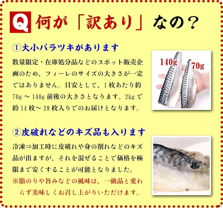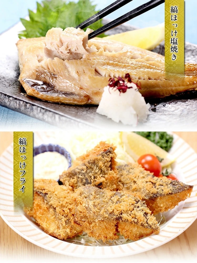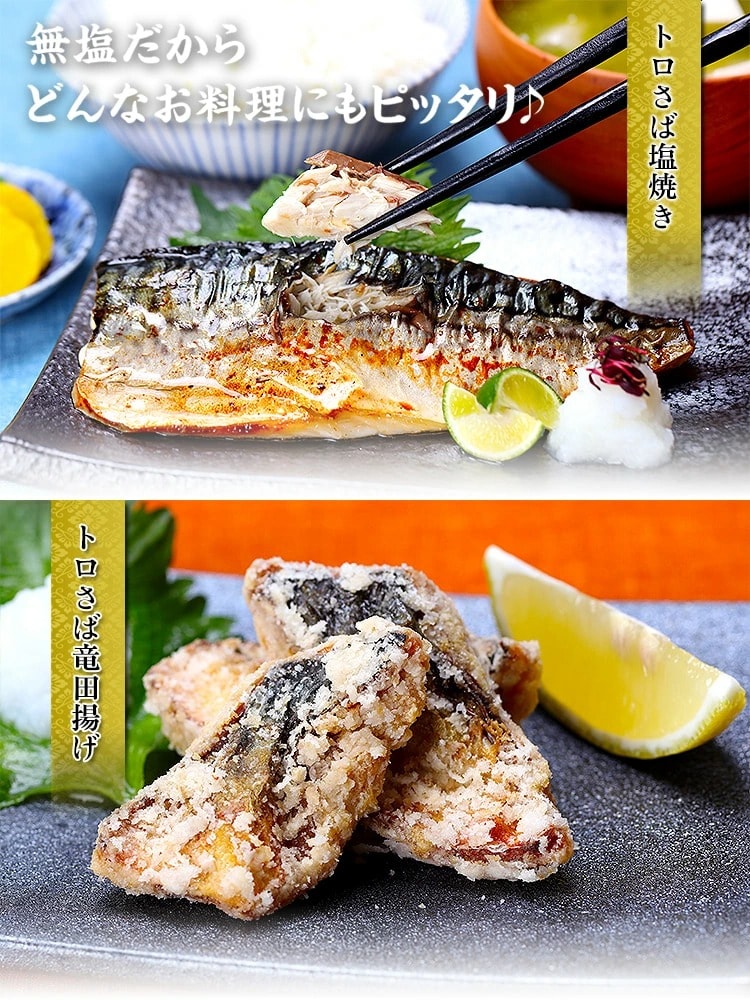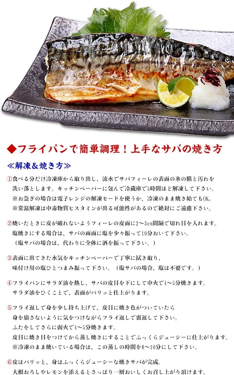 ≪無塩≫トロさば & 縞ほっけ 半身フィーレ フライパンで簡単調理!美味しい塩焼きの調理方法をご紹介します。 ≪解凍&焼き方≫ 【1】食べる分だけ冷凍庫から取り出し、流水で表面の汚れを洗います。 キッチンペーパーに包んで、冷蔵庫で5時間ほど解凍して下さい。 ※お急ぎの場合は電子レンジの解凍モードを使うか、冷凍のまま焼き始めるのも可能です。 ※さばの常温解凍は中毒物質ヒスタミンが出る可能性があるので絶対にご遠慮下さい。 【2】焼いたときに皮が破れないようフィーレの皮面に2~3cm間隔で切れ目を入れます。 両面に塩を少々振って10分おいて下さい。 【3】表面に出てきた水気をキッチンペーパーで丁寧に拭き取り、 味付け用の塩ひとつまみ振って下さい。 【4】フライパンにサラダ油を熱し、皮目を下にして中火で4~5分焼きます。サラダ油をひくことで、表面がパリッと仕上がります。 【5】フライ返しで身を少し持ち上げて、皮目に焼き色がついていたら身を崩さないように気をつけながらフライ返しで裏返して下さい。 ふたをしてさらに弱火で4~5分焼きます。 皮目に焼き目をつけてから蒸し焼きにすることでふっくらジューシーに仕上がります。 ※冷凍のまま焼いている場合は、この蒸しの時間を8~10分にして下さい。 【6】皮はパリッと、身はふっくらジューシーな塩焼きが完成。 大根おろしやレモンを添えるとさっぱり一層おいしくお召し上がり頂けます。 ◆焼いて食べるだけじゃない! 何も味付けしていない無塩フィーレなので、焼いて食べる以外にも、煮付けや他の調理方法で美味しくお召し上がりいただけます。焼く以外の調理例)⇒煮付け、南蛮漬け、竜田揚げ、お茶漬け、チャーハン、パスタ、カレー、サンドイッチ、アヒージョ、などなど… |