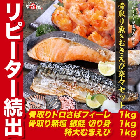 骨取り魚&むきえび楽々セット 1kg×3種 【2/2以降発送】 骨取り 無塩 銀鮭 切身 特大 むきえび 切り身 骨取 お手軽 さば サバ 鯖 鮭 さけ サケ 海老 エビ えび