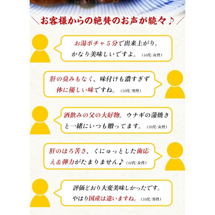 冷凍庫から肝焼きを取り出し、凍ったまま湯せんで5分温めるか、お皿に移してラップをして電子レンジで1分ほど温めてお召し上がり下さい。おつまみ、お酒のあて、肝どんぶりなど幅広い用途にご利用いただけます。 |